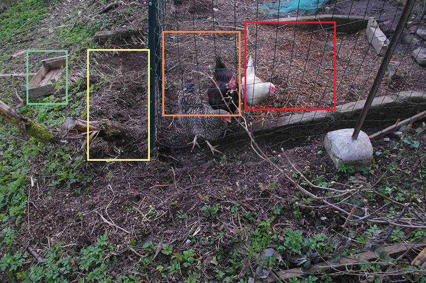 Le grattage et les fientes des poules ont transformés ces tailles en broyat (zone orange) avant d’être expulsé en zone jaune.