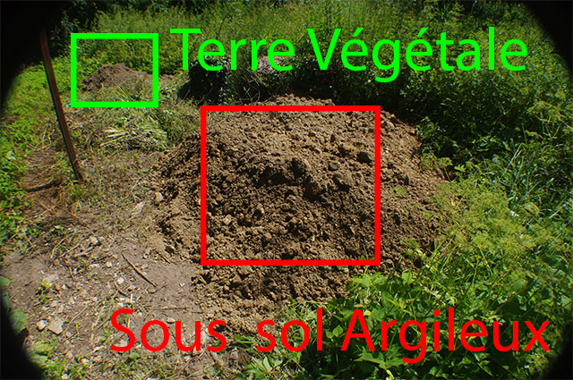Lors de la création de la serre enterrée la terre fut séparée en deux tas. L’un devant servir de matière première pour une futur construction (sous sol argileux, orangé), l’autre pour la culture (Terre végétale plus foncée). Il va nous servir de base pour le terreau.
