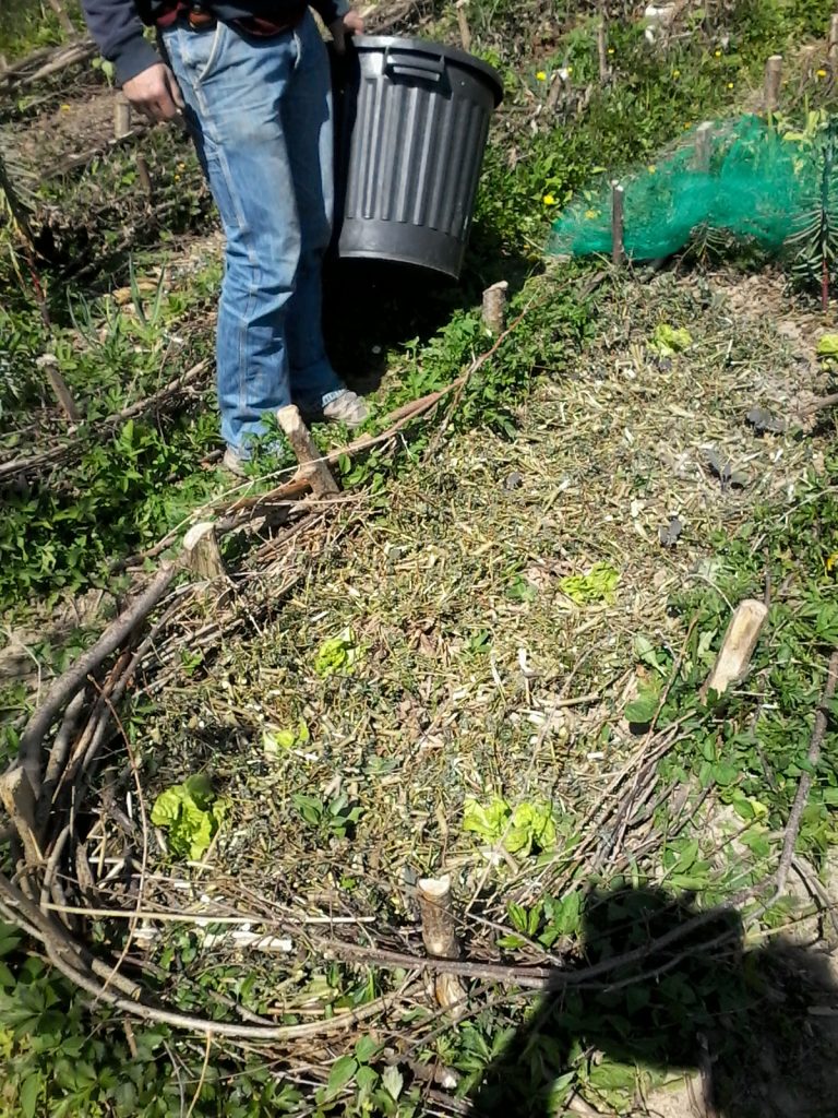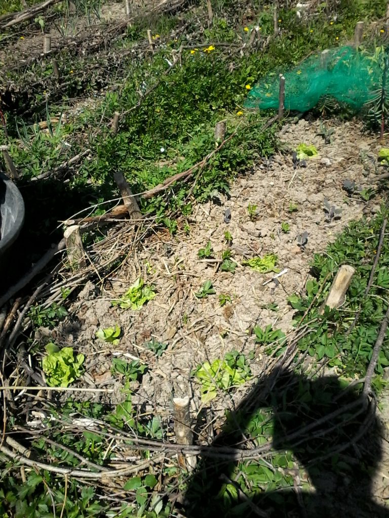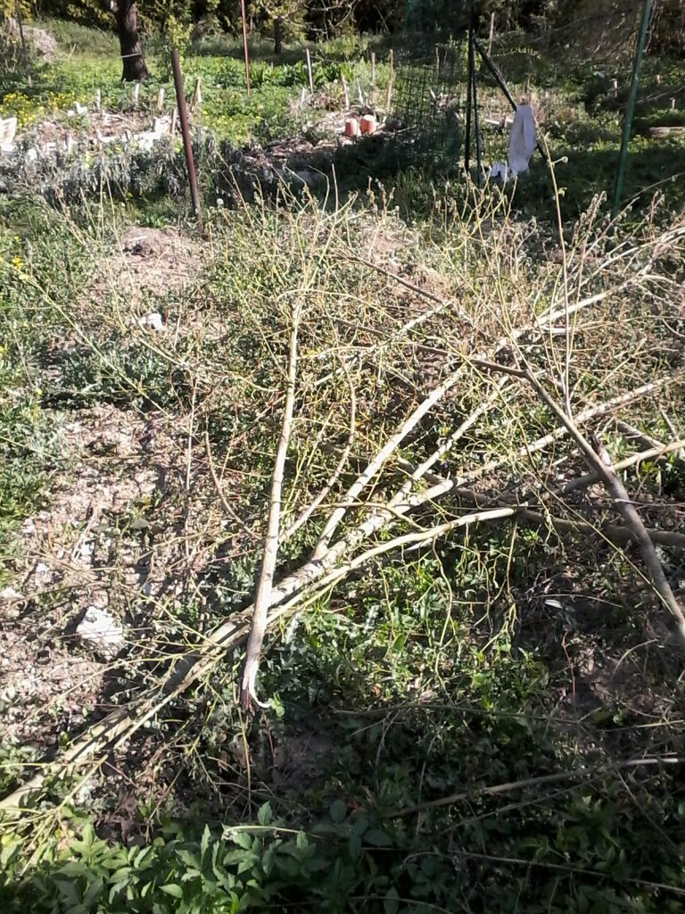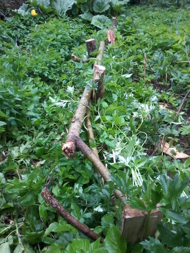 J’utilisai les grandes branches afin de renforcer les bordures des butes, que ce soit en tant que piquet ou en tant que cloisons. Ces éléments finiront par se dégrader en humus qui sera alors intégré à la butte, puis remplacé par du nouveau matériau végétal.