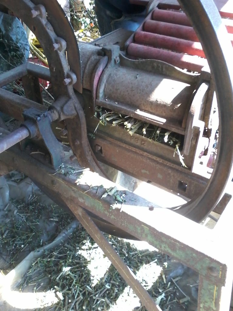 J’ai transporté les branches fines au tranche paille où avec un peu d’huile de coude nous les avons transformées en Broyat Raméal Fragmenté ( BRF ). Je conseille de les traiter quand elles sont encore vertes, cela facilite grandement le travail au tranche paille. Avant d’avoir cet outil je faisais cette tâche à la hache, ce qui est plus long et fatiguant.