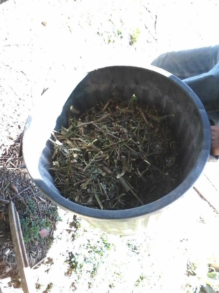 J’ai dégagé les grandes branches à la serpe et j’ai mis les plus fines dans une poubelle afin de pouvoir les transporter plus facilement.