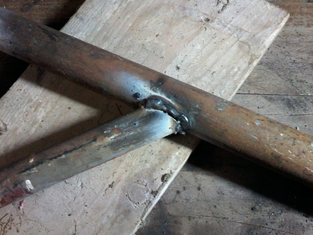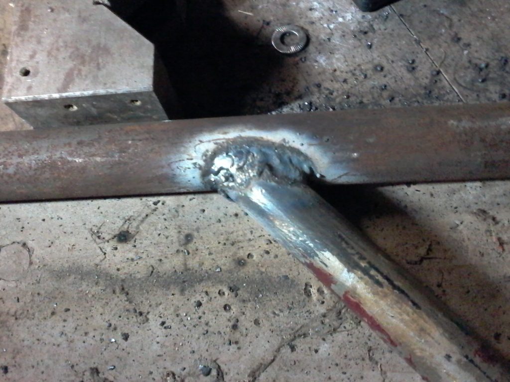 Puis je soude les barres entre elles. Souder des tubes n’est pas si évident, du coup il faut commencer à faire un bourrelet de métal qui sera charger jusqu’à ce que les deux parties soient réunies.